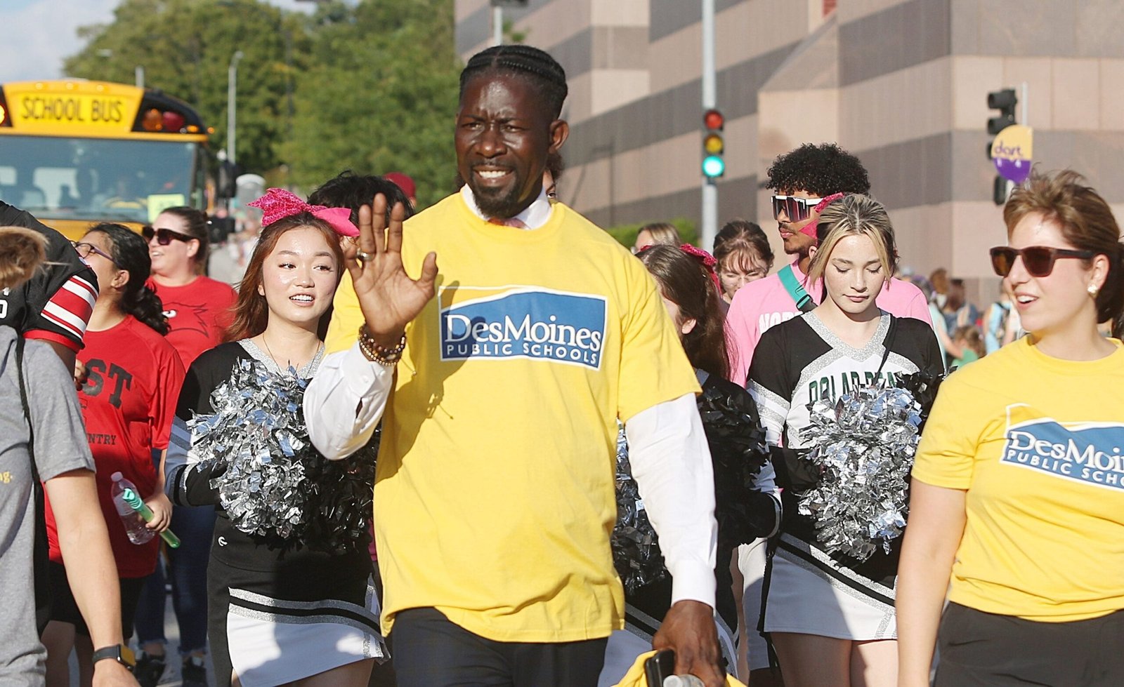 The Superintendent of the School District of Des Moines, Dr. Ian Roberts, greets the crowd as passing by Grand Avenue during the Parade of the Iowa State Fair, on August 9, 9 of 2023, in Des Moines, Iowa.