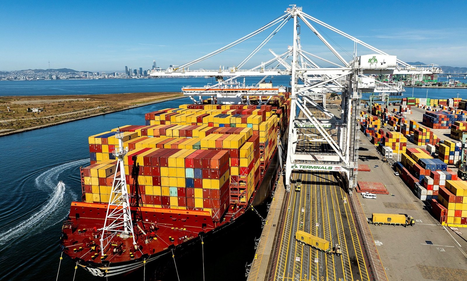 Load containers border a ship in the port of Oakland, on August 6, 2025, in Oakland, California.