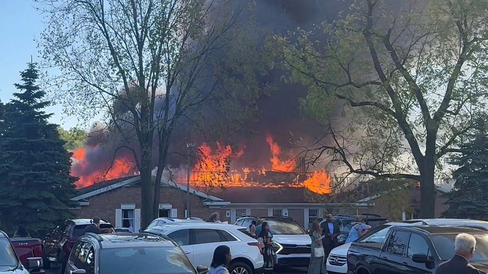 The smoke and fire rise, after an incident in which a man crashed his vehicle through the front doors of a Michigan church and opened fire with an assault rifle and turned on the church in Grand Blanc, Michigan, on September 28, 2025.