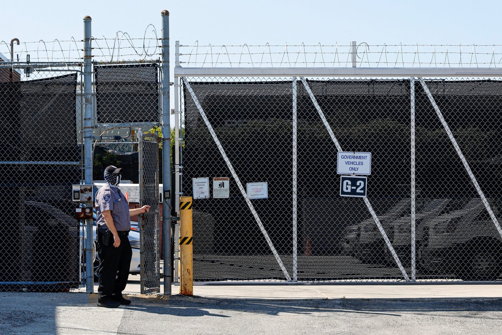 A security guard monitors the street outside an immigration and customs processing center (ICE) on Broadview, Illinois, on September 10, 2025.